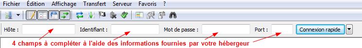 b) Remplissez les champs « Hôte », « Identifiant », « Mot de passe », « Port » (cf.image ci-dessous), sur la base des informations de connexion FTP fournies par votre hébergeur.