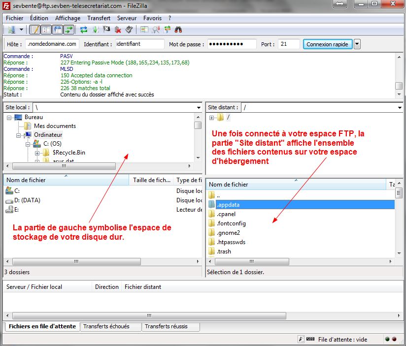NB : Une fois connecté à votre espace FTP (cf. image ci-dessous), vous constaterez que la partie droite de l’écran (« Site distant ») détaille l’ensemble des fichiers présents sur votre espace d’hébergement tandis que la partie gauche (« Site local ») représente l’espace de stockage de votre disque dur.